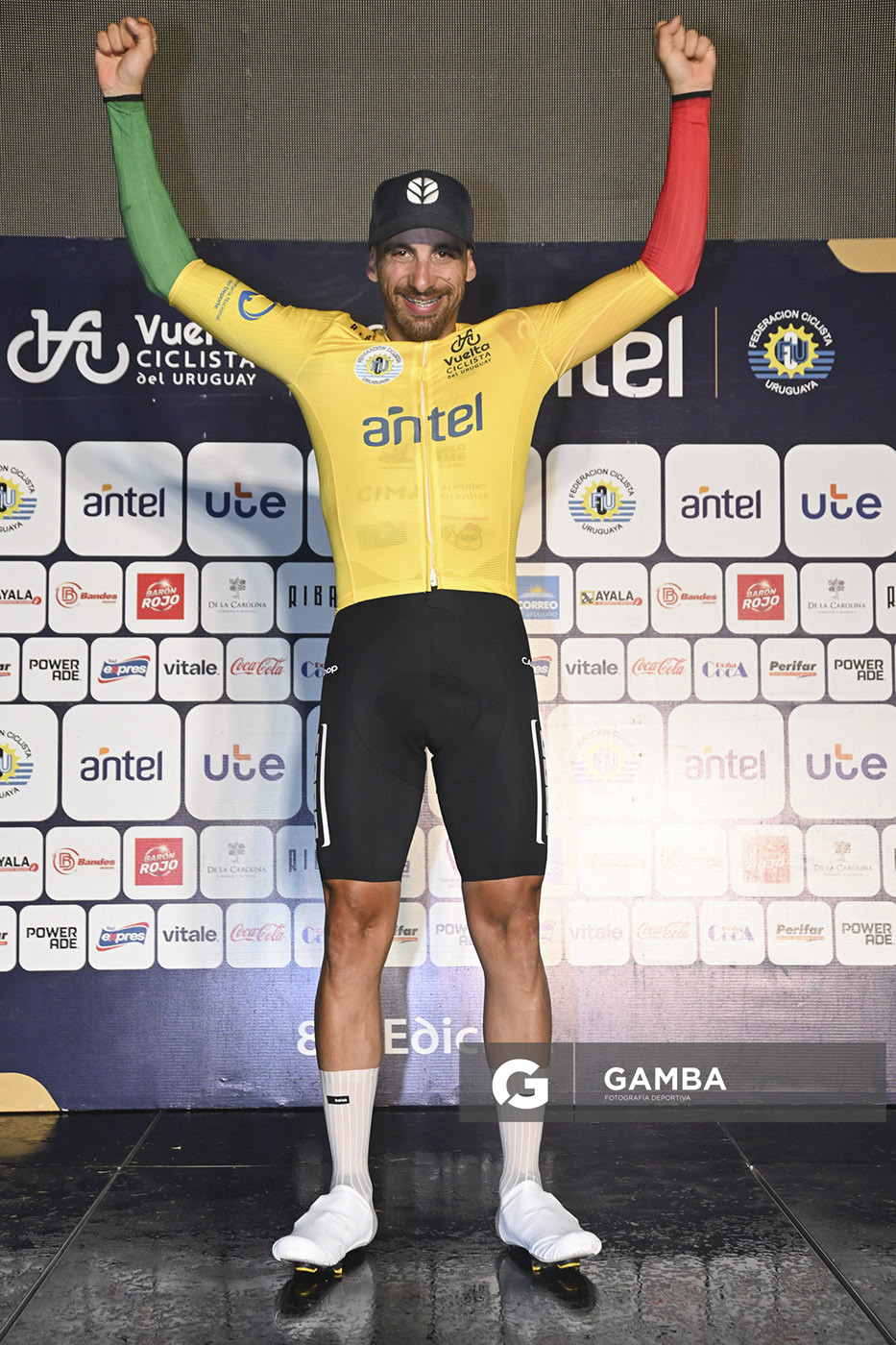 Guillermo Legaria-20260401GL-2004./ Lucas Gaday, de Dolores Cycles Club. Malla oro líder de la competencia, en el podio de la Etapa 7a y la Contrarreloj Individual sobre 19,4 km de la 81ª Vuelta Ciclista del Uruguay el 1 de abril de 2026, en el Lago Merín. / Foto: Guillermo Legaria, Agencia Gamba.-