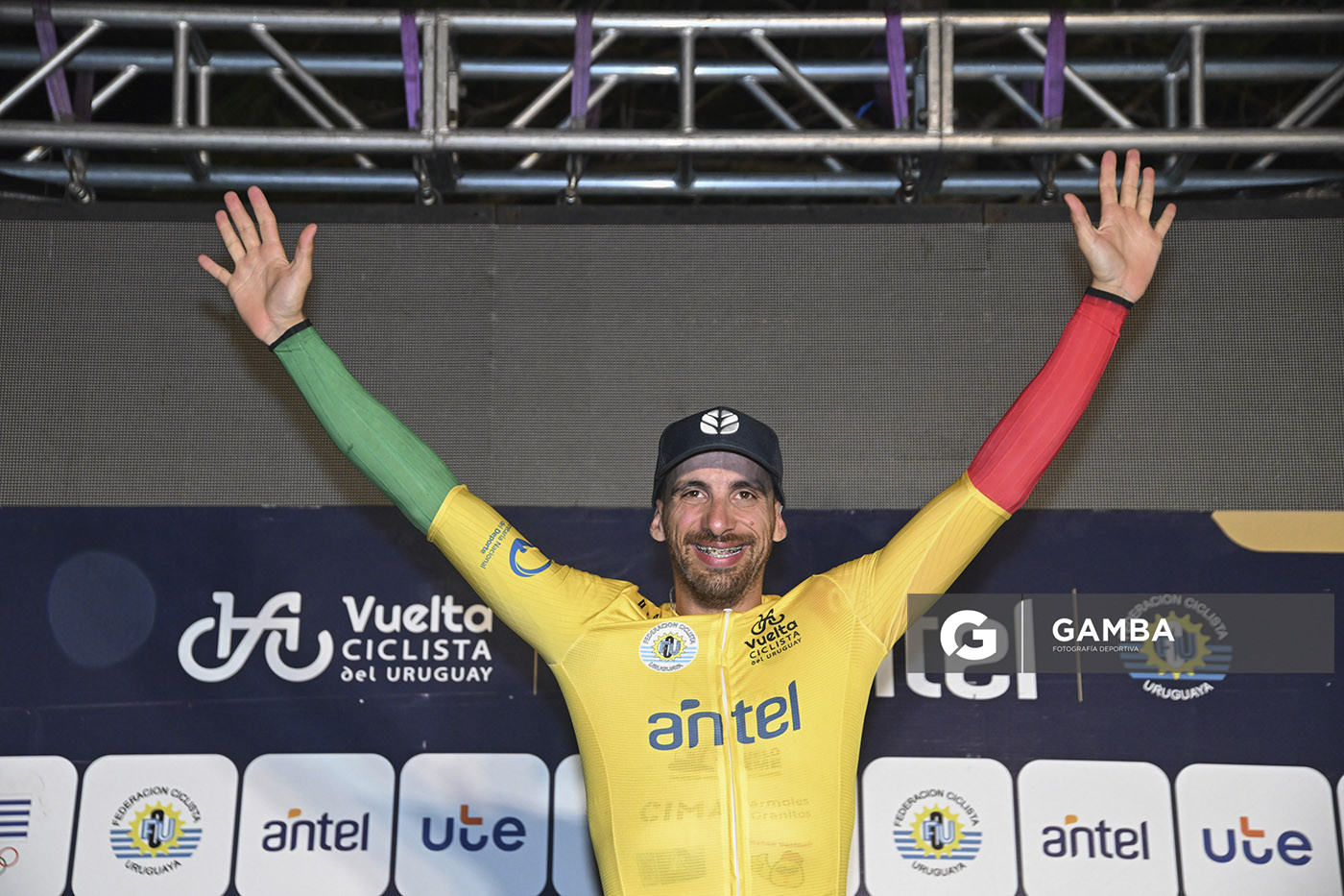 Guillermo Legaria-20260401GL-2005./ Lucas Gaday, de Dolores Cycles Club. Malla oro líder de la competencia, en el podio de la Etapa 7a y la Contrarreloj Individual sobre 19,4 km de la 81ª Vuelta Ciclista del Uruguay el 1 de abril de 2026, en el Lago Merín. / Foto: Guillermo Legaria, Agencia Gamba.-