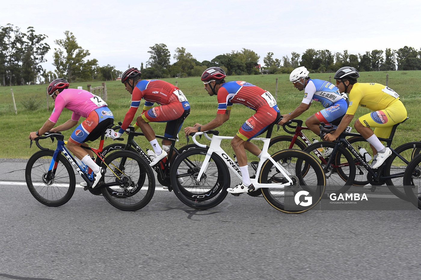 Sandro Pereyra-20260405SP-1054./ Leonel Rodríguez, Robert Racedo, Anderson Maldonado, Pablo Bonilla, de Club Náutico y de Pesca Boca de Cufré; y Diego González, de Sportivo Club Olimpia. Etapa 11 Trinidad – Montevideo sobre 190,6 km de la 81ª Vuelta Ciclista del Uruguay el 5 de abril de 2026. / Foto: Sandro Pereyra, Agencia Gamba.-