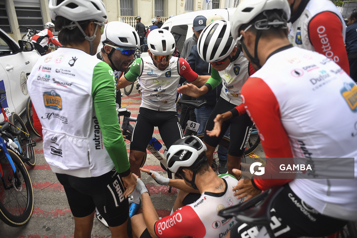 Sandro Pereyra-20260405SP-0144./ Lucas Gaday, de Dolores Cycles Club, con sus compañeros de equipo previo a la largada de la Etapa 11 Trinidad – Montevideo sobre 190,6 km de la 81ª Vuelta Ciclista del Uruguay el 5 de abril de 2026. / Foto: Sandro Pereyra, Agencia Gamba.-