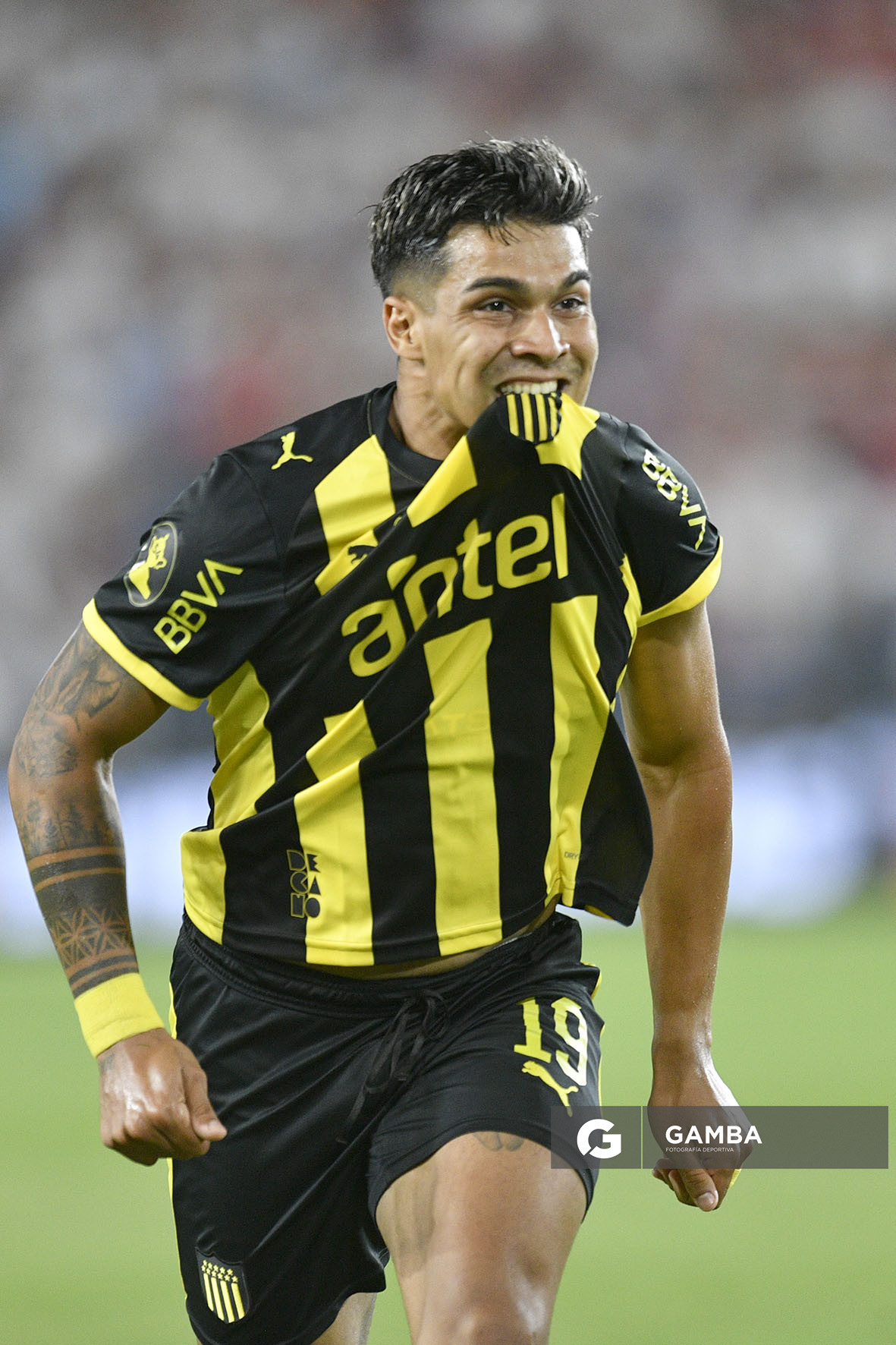 Fernando Morán-20260301FM-0836./ Matías Arezo, de Peñarol, tras convertir el primer gol de su equipo durante el partido Nacional vs Peñarol por la cuarta fecha del Torneo Apertura de la Liga AUF Uruguaya 2026, el 1 de marzo de 2026 en el Estadio Gran Parque Central, en Montevideo. / Foto: Fernando Morán, Agencia Gamba.-