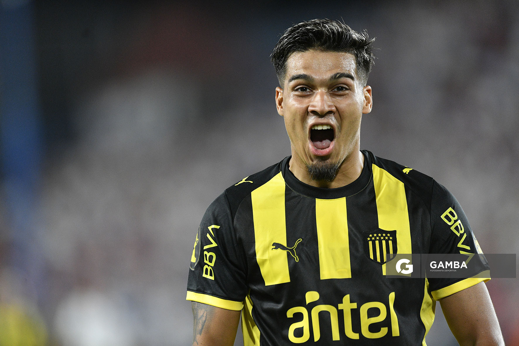 Fernando Morán-20260301FM-0863./ Matías Arezo, de Peñarol, tras convertir el primer gol de su equipo durante el partido Nacional vs Peñarol por la cuarta fecha del Torneo Apertura de la Liga AUF Uruguaya 2026, el 1 de marzo de 2026 en el Estadio Gran Parque Central, en Montevideo. / Foto: Fernando Morán, Agencia Gamba.-